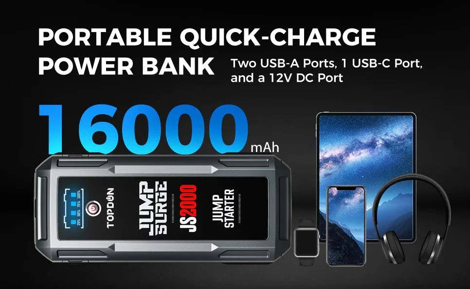 The TOPDON JumpSurge 2000 (JS2000) is a must-have tool for every vehicle owner. With a peak current of 2000 amps, this powerful jump starter can safely revive dead batteries on 12V vehicles, including cars, trucks, motorcycles, SUVs, boats, yachts, snowmobiles, lawnmowers, and more. Designed to deliver up to 35 jump starts on a single charge, the JS2000 also functions as a portable power bank and an ultra-bright LED flashlight, making it a versatile travel companion and emergency lifesaver.
