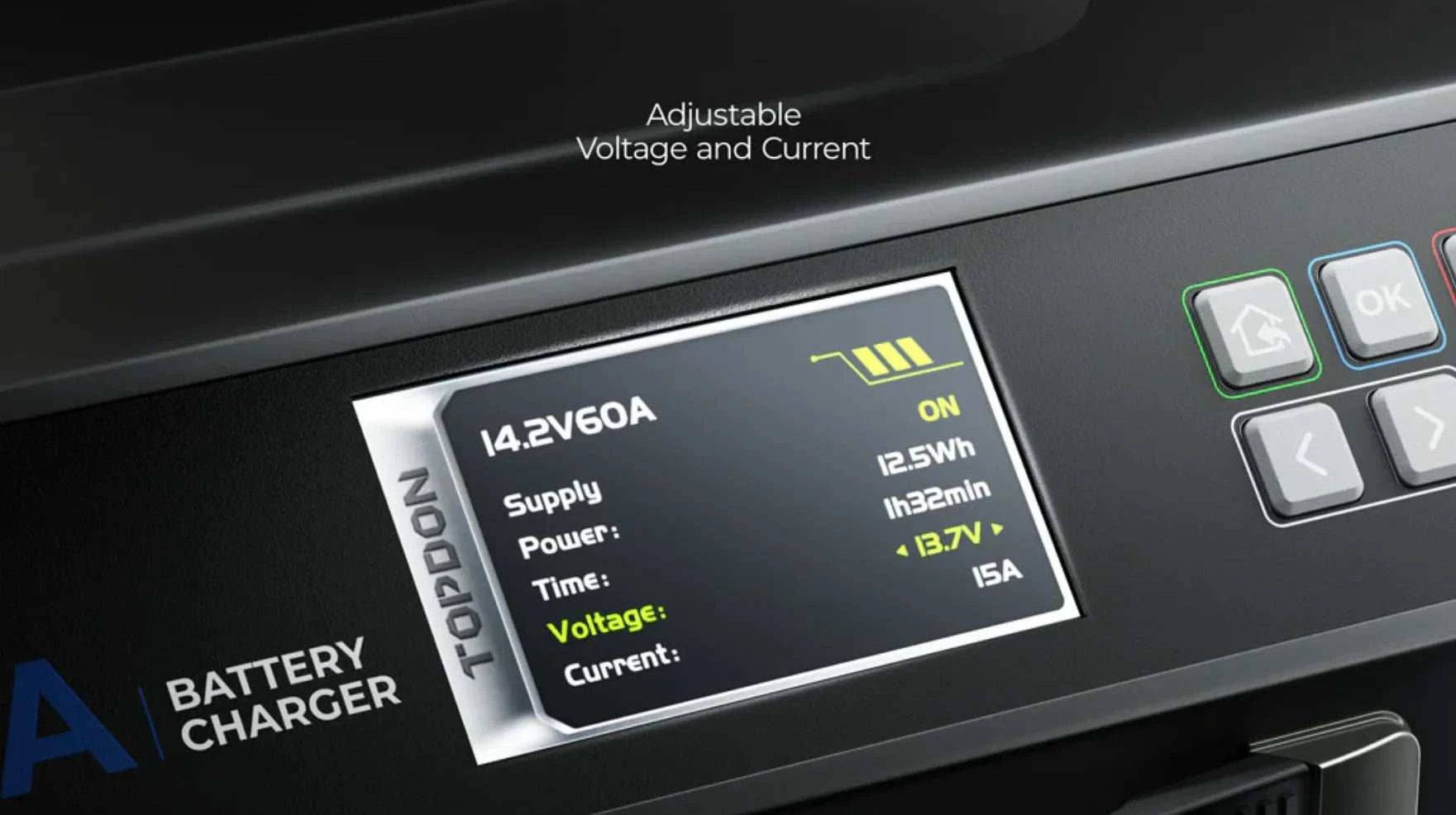 - Real-time voltage (11–16.8V) and current (5–120A) adjustments for precise charging and testing.